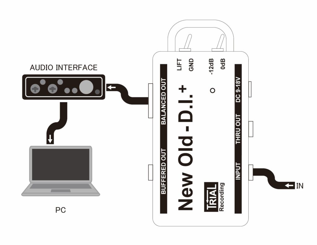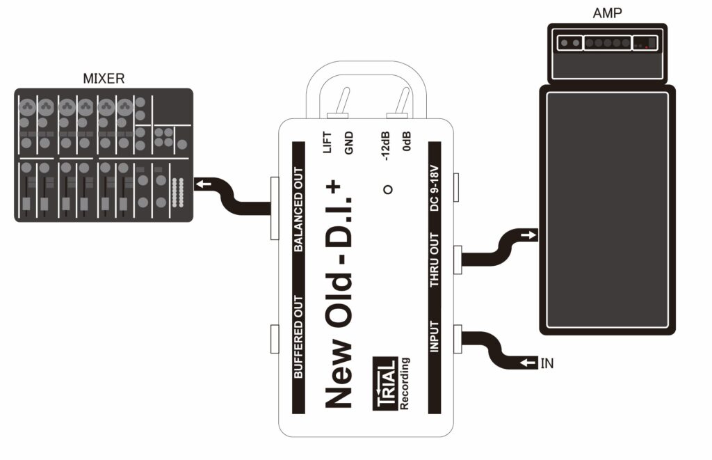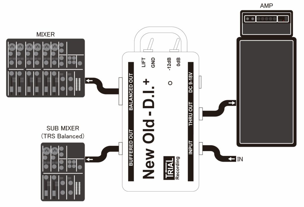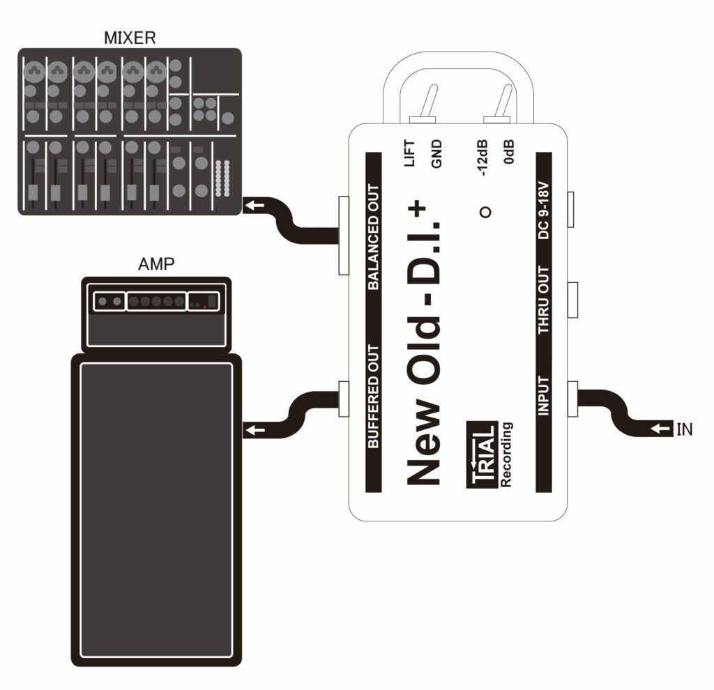 一般的なDIは、ミキサーへ信号をキャノンケーブルで送り、ステージ上のアンプへはスルーアウトから信号を送ります。